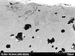 对转向节臂的2号试件断口部位进行扫描电镜观察,得到试件断口微观形貌,在断口的四周表面有微裂纹缺陷,为微裂纹的萌生和扩展提供了条件;断口表面被氧化物所覆盖,但局部仍可观察到断口为铁素体基体球墨铸铁的脆性断裂。